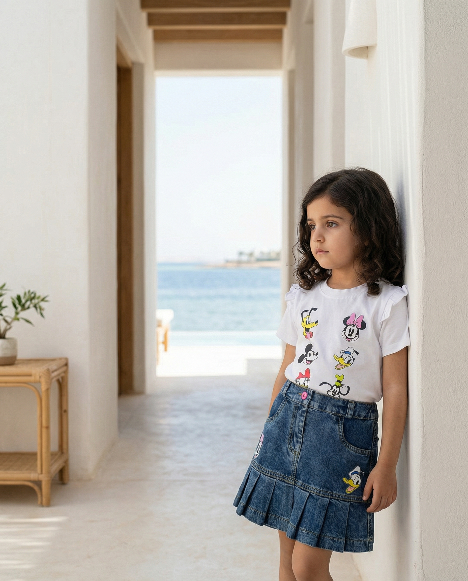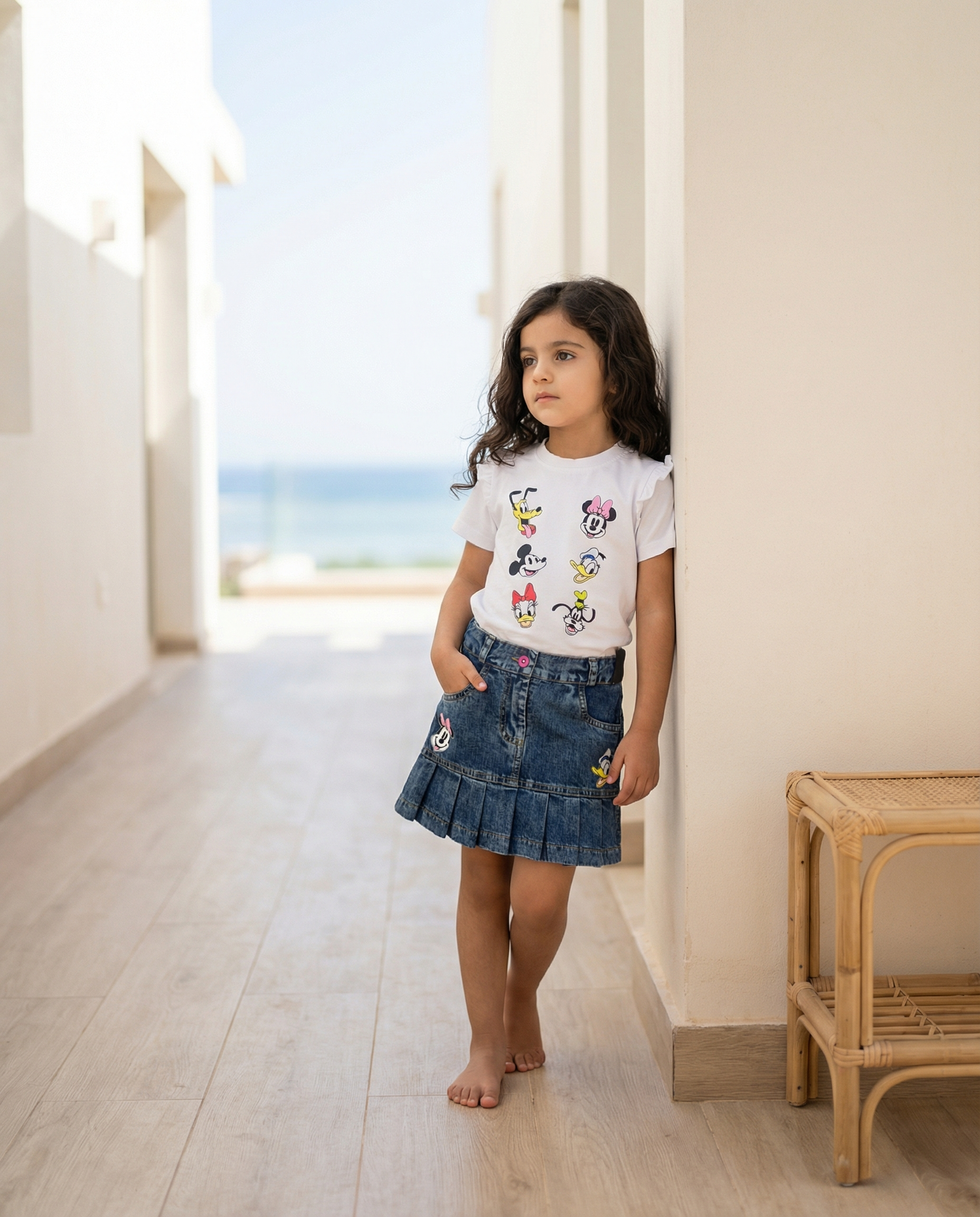 This fun set features a white t-shirt with sweet ruffle sleeves and a playful all-over character print showcasing Mickey, Minnie, Donald, Daisy, Pluto, and Goofy. It pairs perfectly with a dark denim skirt that boasts front pockets, a button closure, and adorable character appliqués of Minnie and Donald near the hem. The skirt finishes with a sweet pleated ruffle hem for extra movement.